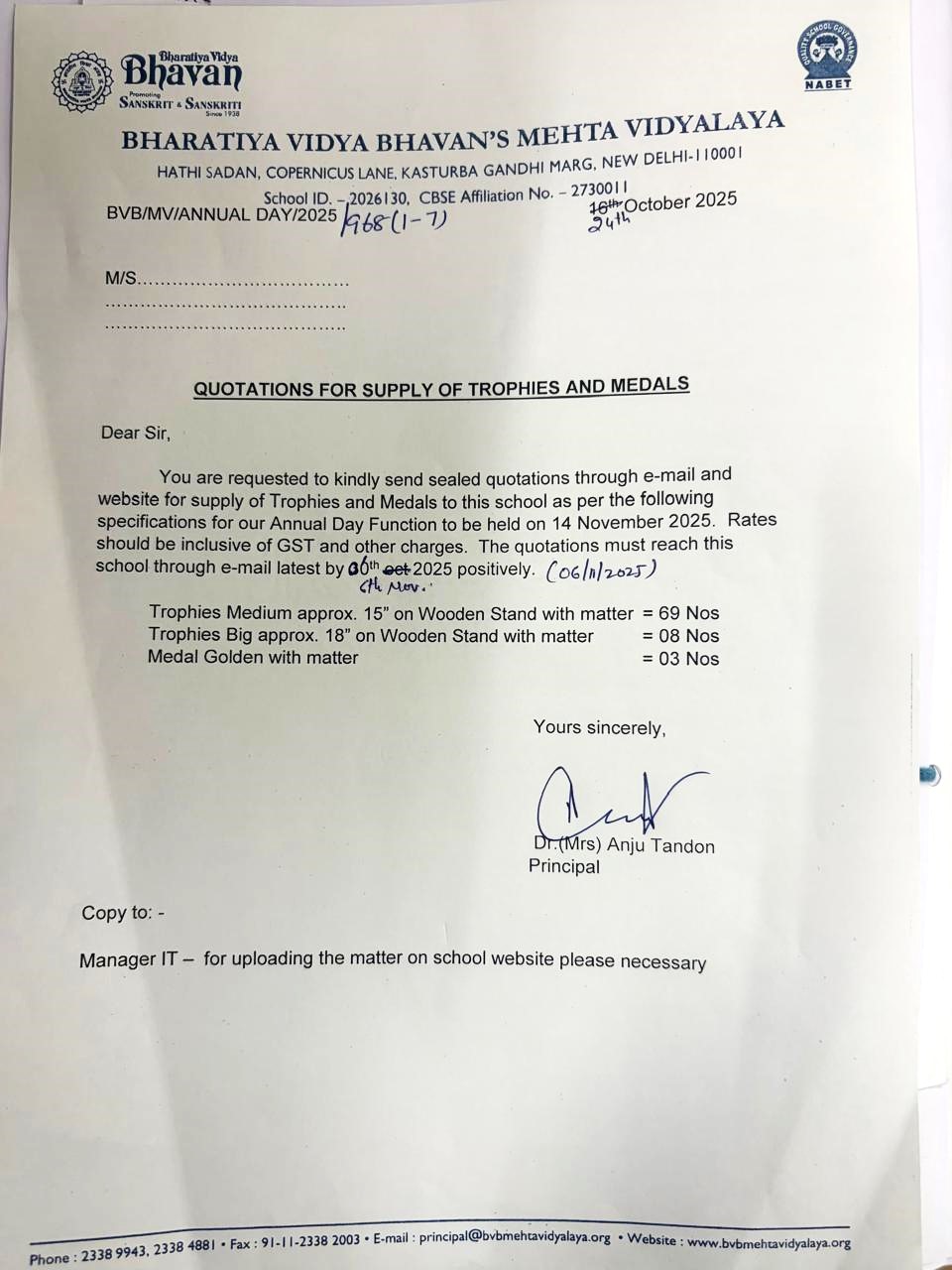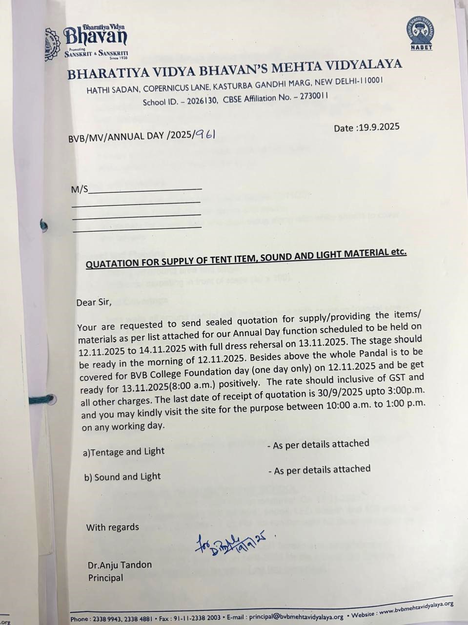 Bharatiya Vidya Bhavan’s Mehta Vidyalaya, nestled in New Delhi, is a Senior Secondary Public School. It had its inception as a community service project in April, 1954. Its management was taken over by the Bharatiya Vidya Bhavan after Delhi home of the Bhavan was inaugurated by Pandit Jawaharlal Nehru on 18th May, 1957. Recognized for its commitment to academic excellence and cultural values, it caters to students from Classes Nursery to XII with a holistic educational approach. The institution, affiliated with the Central Board of Secondary Education (CBSE), provides education in Humanities, Science and Commerce streams. It prepares pupils for the All India Senior School Certificate Examination conducted by the CBSE. The institution stands as a beacon of traditional Indian values, fostering a harmonious blend of cultural heritage and modern education for students in the heart of the nation's capital.
