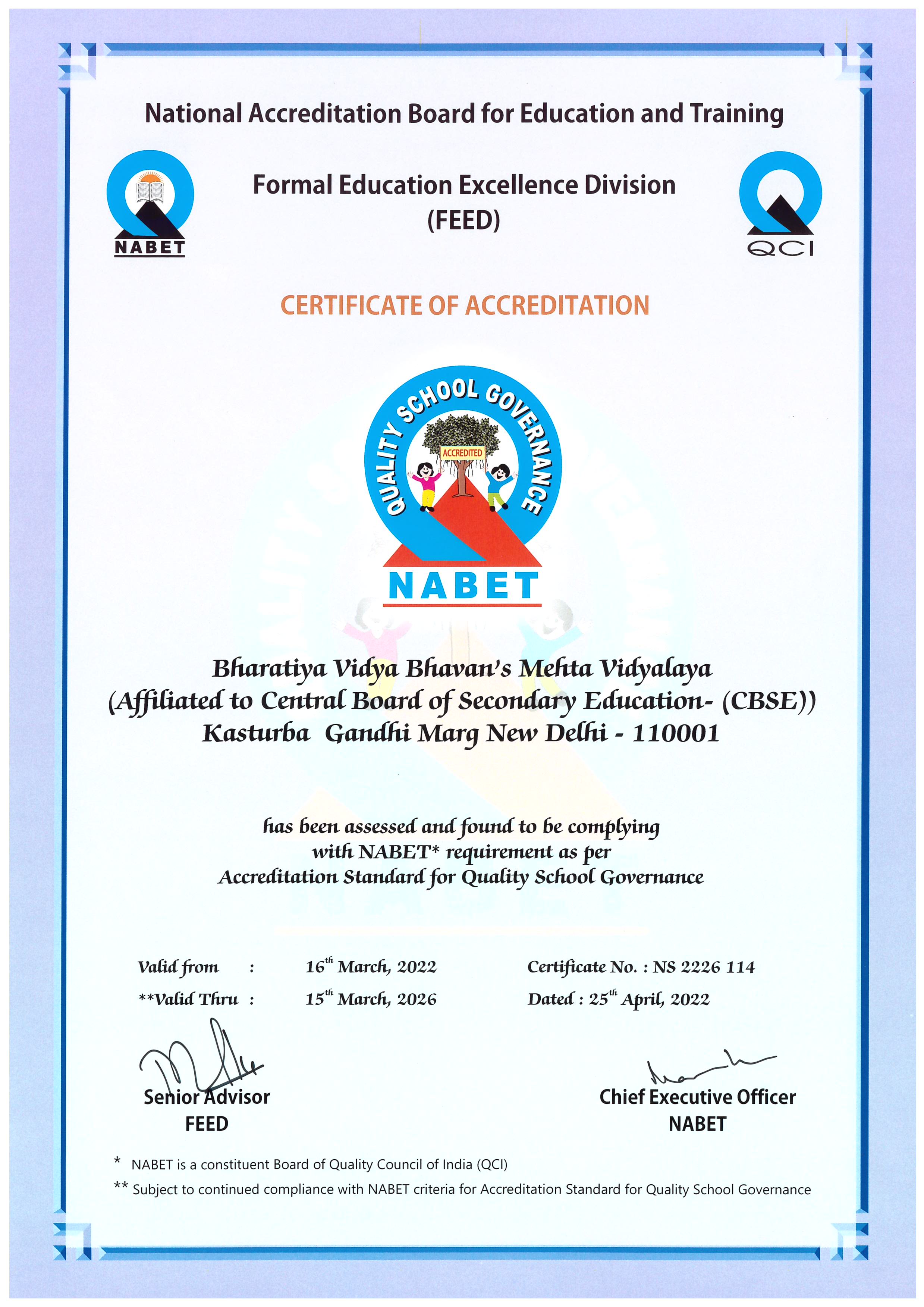 Education and Training (NABET). Mehta Vidyalaya was able to implement the standards