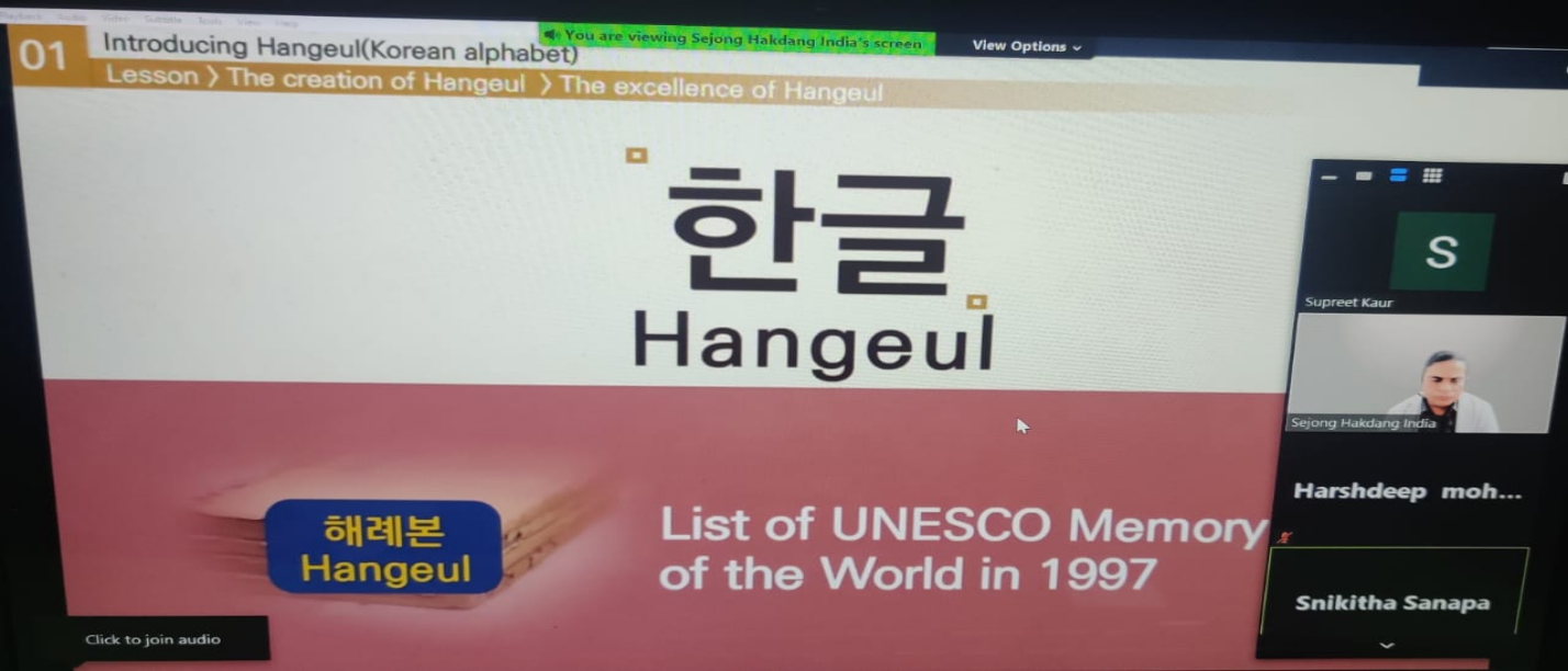 Hobby based Korean language Batch-1 started on 4 May 2021 for a total of 43 students from classes V and VI. The classes were held on zoom, thrice a week for a duration of 30 hours. The course included learning the basics of Korean Language and culture. Students were made aware of Korean National Symbols, Korean alphabet historical background, Korean Culture. Learning took place through games, fun activities and audio-visual teaching material.